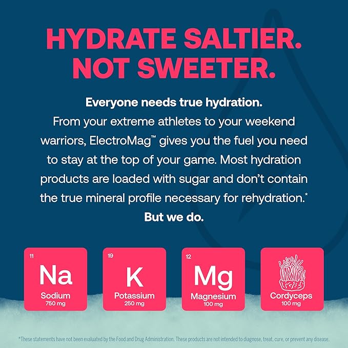 - TRUE DIFFERENCE - ElectroMag is crafted with intention using carefully sourced ingredients. Contains 750 mg sodium, 1390 mg chloride, 250 mg potassium & 100 mg magnesium for essential minerals; 100 mg fruiting body cordyceps mushroom for endurance.