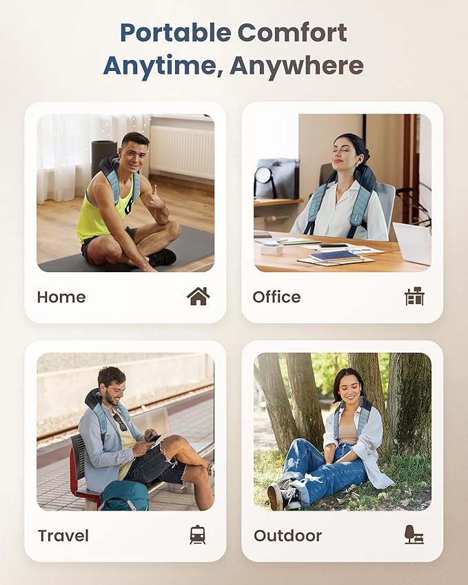 - 【Intelligent Kneading, Deep Neck & Shoulder Relaxation】Shiatsu neck massager for pain relief deep tissue equipped with a 4D massage head, it delivers 8-point precision kneading and acupressure techniques, conforming to the natural curves of the neck and shoulders. Moving beyond traditional single-mode vibration, neck massager with heat deeply eases discomfort from prolonged sitting, neck/shoulder soreness, and is suitable for office workers, frequent phone users, and seniors.