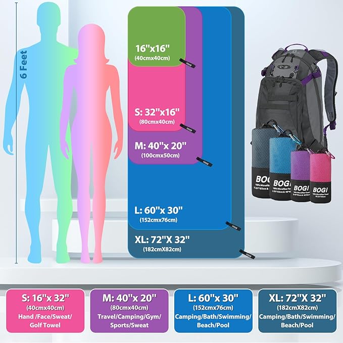- 4 Sizes & Multi Use: BOGI microfiber towel set has 4 sizes in 6 colors. S: 16"x32" (2Pcs) is suitable for daily use, right size for your face, neck or hands to wipe the sweat off. M: 40"x20", best for backpacking, travel, camping, swimming, yoga, gym. L: 60"x30"+16"x16", good as a bath towel, microfiber towel for body or as a cape, blanket to keep warm, cover your deck chair. XL: 72"x32"+16"x16", an excellent pack towel for beach blanket, picnic mat, wall blanket or fashion as a tablecloth.