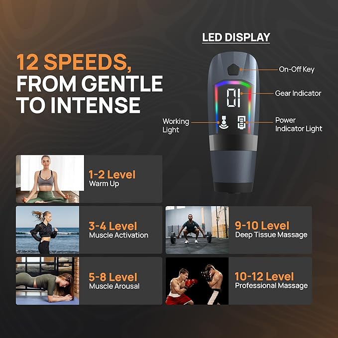 - ๐๐ ๐๐ฉ๐๐๐ ๐๐๐ฏ๐๐ฅ๐ฌ ๐ฐ๐ข๐ญ๐ก ๐๐๐ ๐๐ซ๐๐๐ข๐ฌ๐ข๐จ๐ง ๐๐จ๐ง๐ญ๐ซ๐จ๐ฅ: This Electric Muscle Relaxation with 12 adjustable speed settings ranging from (2200 RPM) to deep tissue therapy (3500 RPM). The LCD screen displays battery life, speed, and timer for effortless adjustments.