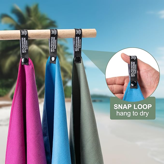 - 【EASY PACKING & HANGING】Travel Towel with a convenient carry bag and a quick-snap hang loop,Easy to pack, minimising luggage space and weight.Allow for hanging on towel racks, running machian, branches at campsites, or beach umbrellas. Making them the perfect companion for your daily adventures