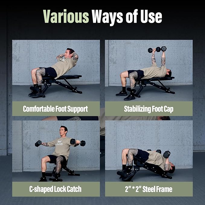 - 900LBS Weight Capacity: Engineered with a commercial-grade square steel frame and a triple triangle structure, our adjustable weight bench has undergone rigorous testing to ensure it can bear up to 900 pounds. Four rubber feet are installed on the bottom to enhance stability and safety. With this exercise bench, you can lift weights with complete confidence, backed by unwavering support