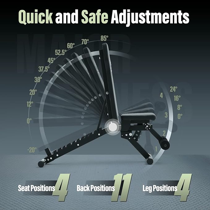 - Quick and Easy Adjustments: This workout bench offers 11 back adjustments, 4 seat adjustments, and 4 leg adjustments. It can meet the needs of different training postures such as Bench presses, Push-ups, and -20° decline Sit-ups, etc. The seat adjustments pull the support bar to switch gears in seconds, and back adjustments can adjust it by easily changing the card slot, saving you time during your workout