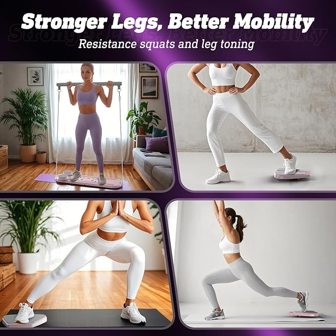 - 【15-in-1 Full-Body Workout Pilates Board】Unlock 15+ exercises in one compact pilates reformer set! Perfect for full-body conditioning, this multifunctional board supports planks, side planks, advanced dynamic planks, crunches, knee tucks, bicep curls, squats, goblet squats, lunges, calf raises, wide-grip push-ups, close-grip push-ups, tricep dips, and more. Designed to tone muscles, build strength, and improve flexibility, it’s the ultimate fitness tool for home or on-the-go workouts