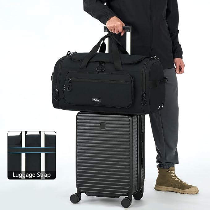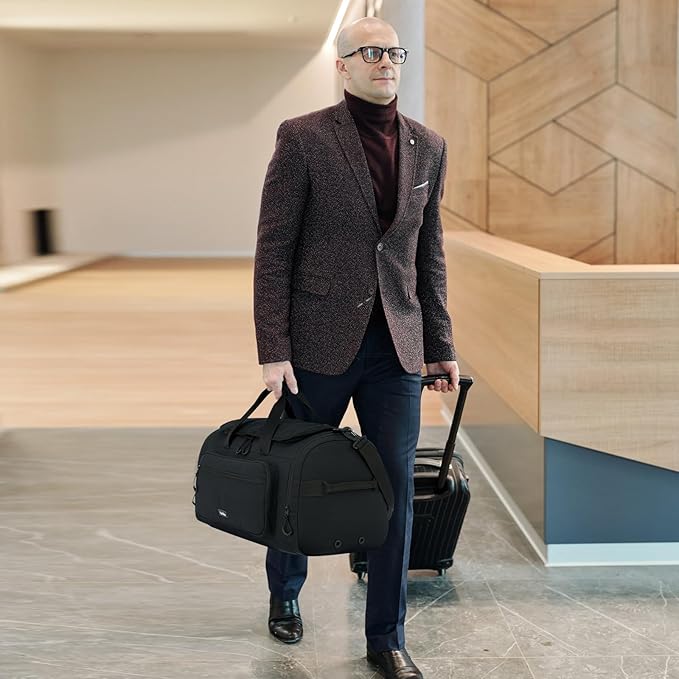 - [Extra Large Capacity] This 55L large duffel bag provides 8 specialized compartments. In the main compartment, it's roomy enough to accommodate 3-5 days clothings and various tech products, 2 mesh pockets for valuables like wallet, card, cash, toghther with ventilated shoe compartment. Moreover, 2 front quick-access pockets fits passports, boarding passes, books, cosmetics, phone, glasses, etc, while 2 side pockets good for bottles and umbrellas.