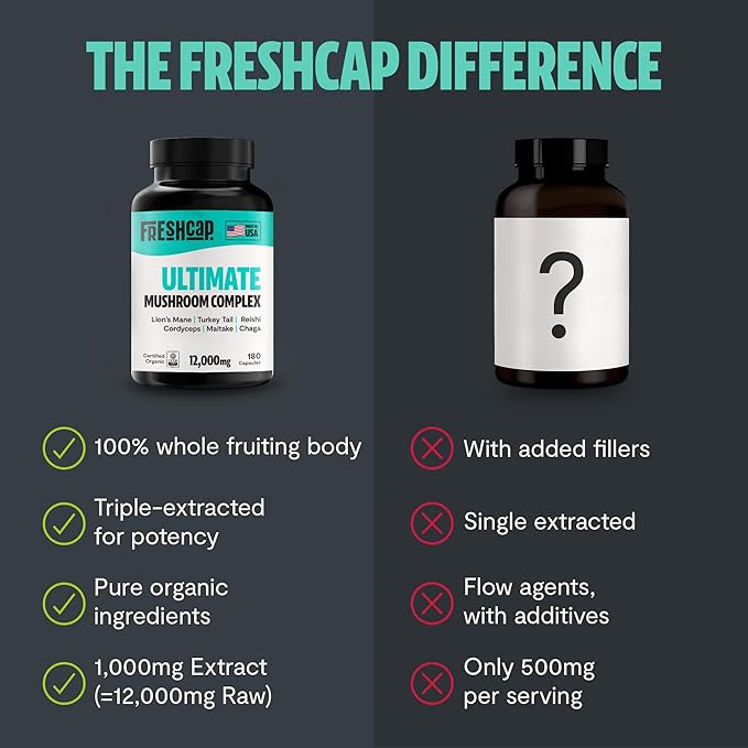 FreshCap Ultimate Mushroom Supplement 12,000mg - Nootropic Complex Capsules, Organic Mushroom Immune Support, Brain Supplements for Memory and Focus, Ayurveda Nootropic (180 Capsules)