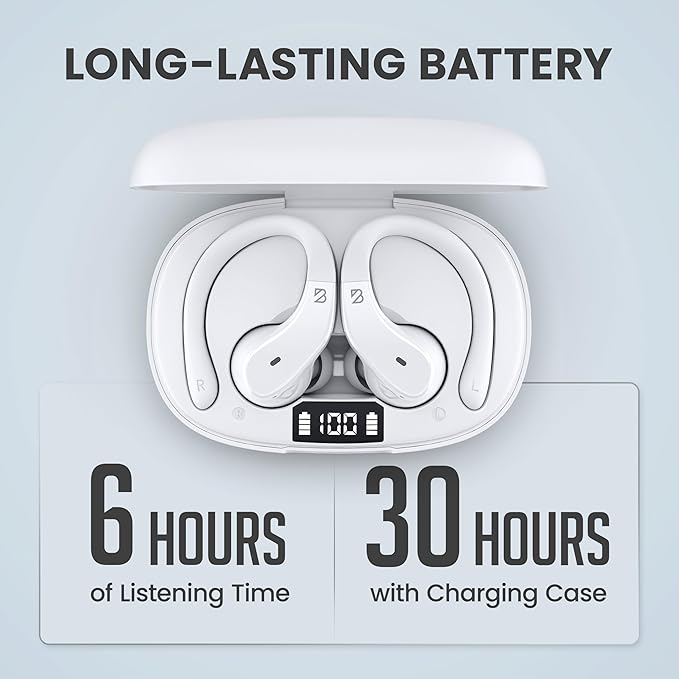 - 30 Hour Battery Life + USB-C Charging: Each of the over ear Blue tooth ear buds can play music for 6 hours, and the charging case keep the wireless earbuds running with 24 hours of music; Charge your sports bluetooth headphones for running once and use them for weeks of workouts; The only gym headphones men and women can use for years on end