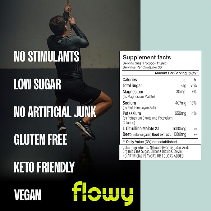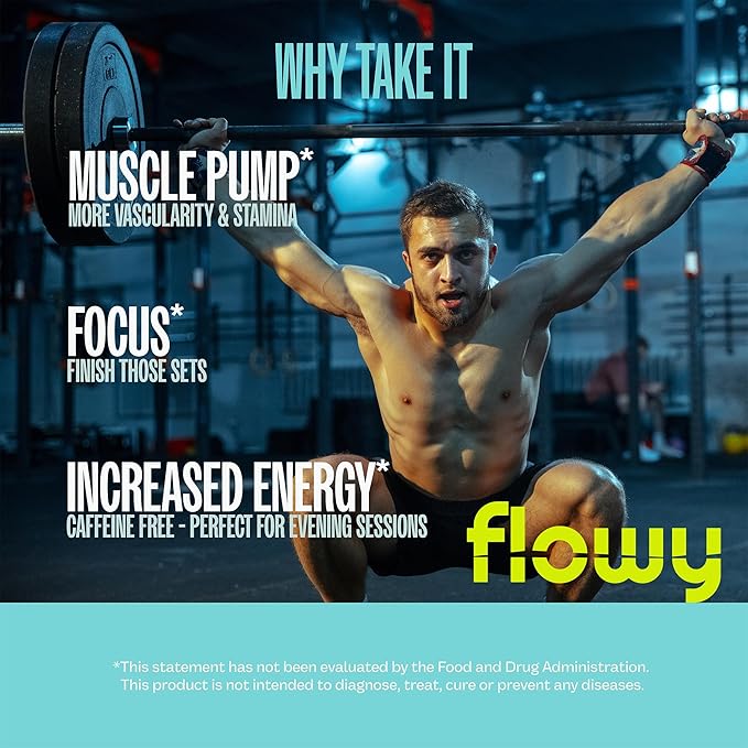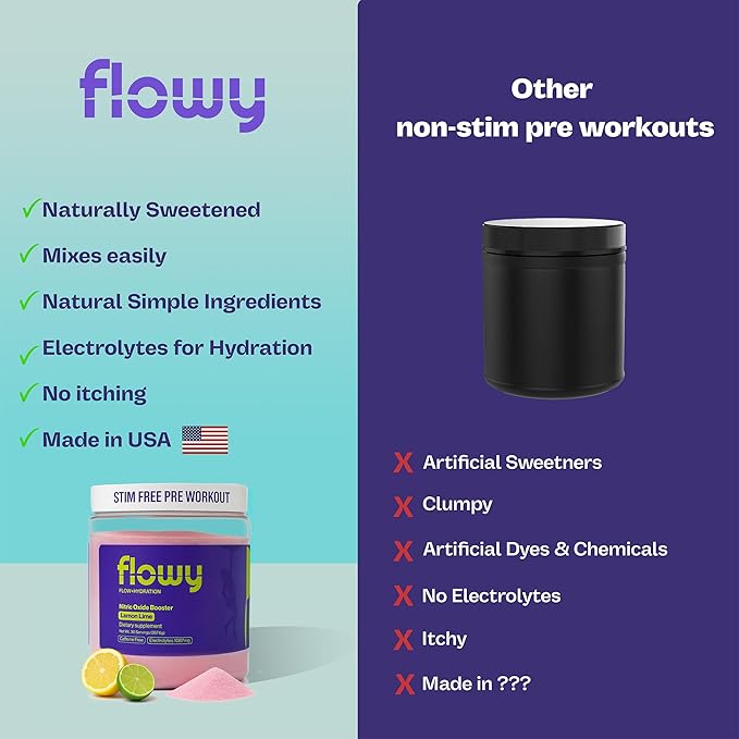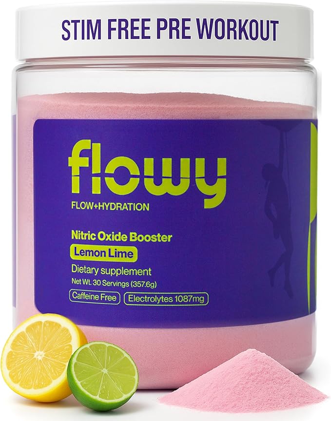 flowy Stim Free Pre Workout – Nitric Oxide Booster for Men & Women | All Natural, Hydration, Non Stimulant Pump, Caffeine-Free, Electrolytes, L-Citrulline, Lemon Lime, 30 Servings