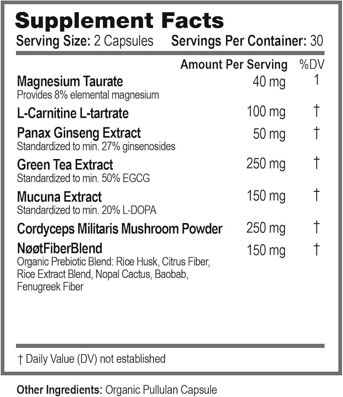 - Primary Supplement Type : Cordyceps Militari, Green Tea (EGCG) and Mucuna, L-Carnitine L-Tartrate, Magnesium Taurate, Panax Ginseng Cordyceps Militari, Green Tea (EGCG) and Mucuna, L-Carnitine L-Tartrate, Magnesium Taurate, Panax Ginseng