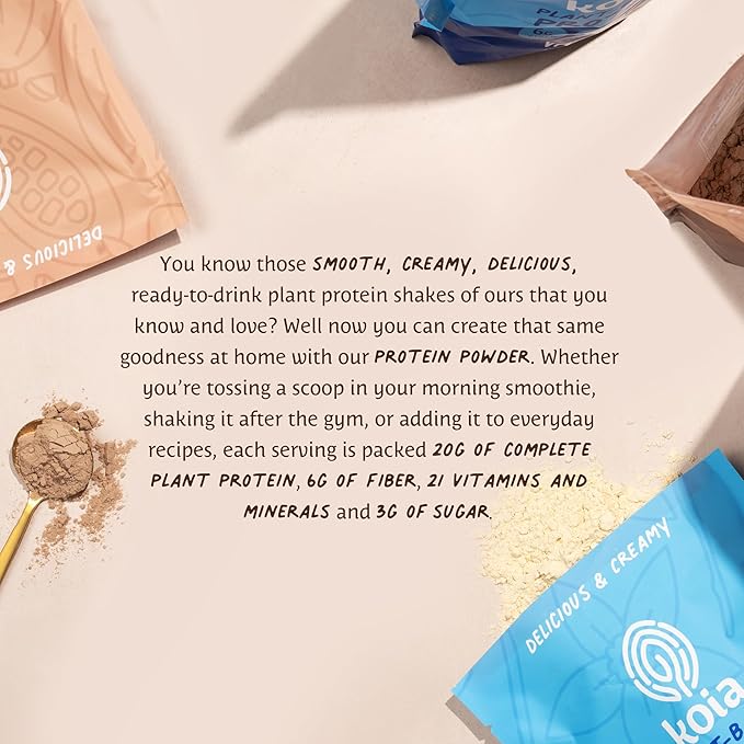 - Chocolate Protein Powder: Enjoy the delicious, creamy goodness of Koia's high-protein, plant-based shakes now in a versatile protein powder that seamlessly fits into your daily routine. A great source of vitamins A, C, D, E & B12, this vegan, non-dairy supplement fuels your body for muscle growth and recovery.