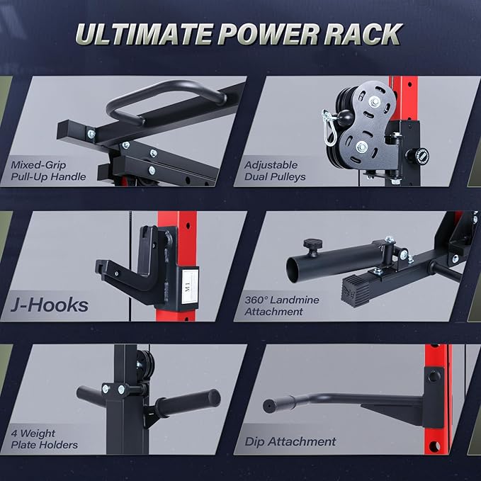 - All-in-One Versatility: Get everything you need for a full-body workout. Your new power rack comes equipped with a high pull-up bar, T-bar, and chest pull-up bar. These accessories unlock countless exercises, so you can target every muscle group from home