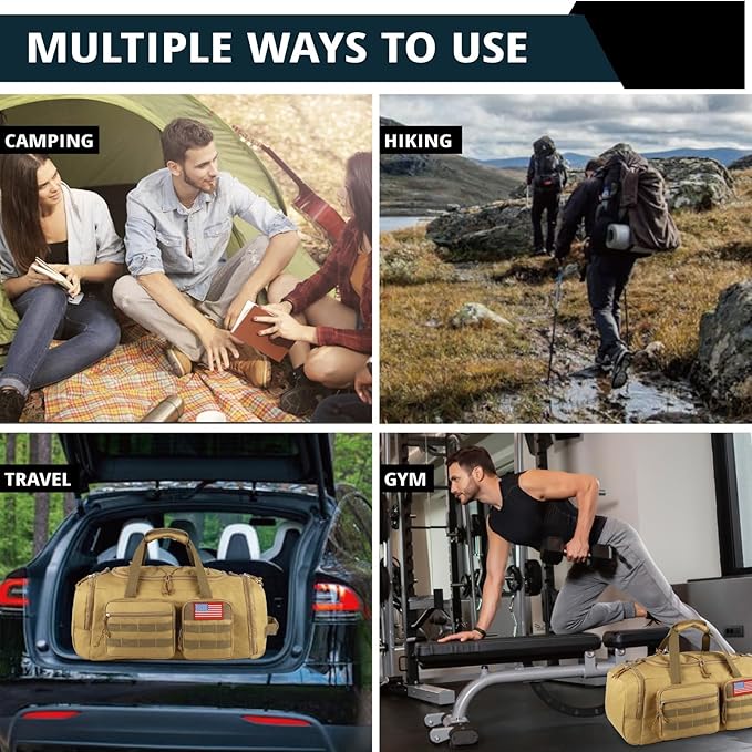 - 【Large Multiple Pockets Gym Bag】Featuring a spacious main compartment and 2 large inner mesh pockets, Travel duffel backpack also includes a dedicated shoe compartment and wet pocket on each side. The front showcases 3 pockets with webbing and a flag patch, while the back has a convenient luggage sleeve pocket. With an adjustable top lanyard, two long haul handles, a grab handle, and a removable shoulder strap, you can carry this bag in multiple comfortable ways.