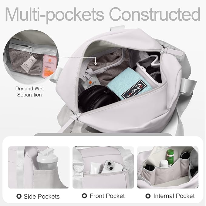 - 【Wet/dry Separation Design】Multi-pockets constructed, 1 front pocket for easy on-the-go storage like storing your phones, passports, power banks or keys. 2 side pocket make your sports water bottle or other small items easy to carry, Multiple internal pockets keep your stuff organised. and dedicated water-resistant PVC pocket for wet items like towels or swimsuits—no more soggy mess!
