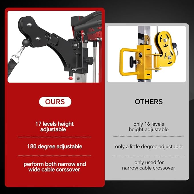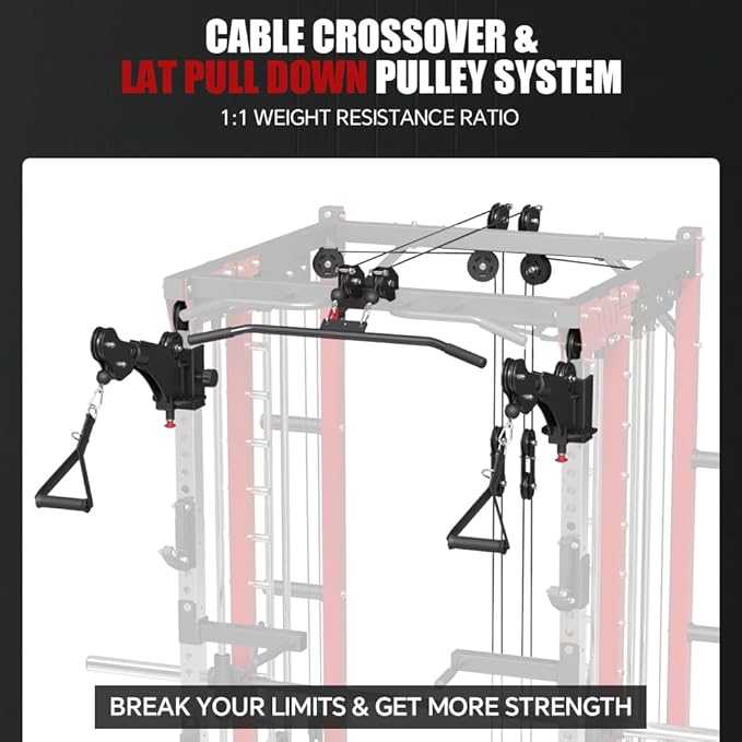 - 180 Degree Rotatable Cable Crossover: Unlike others on the market, our cable crossover attachments on this machine adopts a specific patented design, which are 180 degree rotatable, allowing you to perform both narrow and wide cable crossover to build strength on different muscle groups. The 1:1 ratio lat pull down helps you to achieve a more efficient workout in daily strength training.