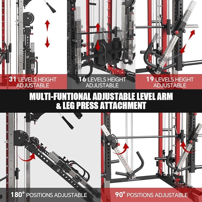 - Full Adjustable Lever Arm and Leg Press: Our 2-in-1 level arm and vertical leg press attachment is full adjustable with its unique desgin. The arms and the handles is both rotatable and height adjustable, which ensures users with different body types and heights can use this machine. Just call on all your family members to join in the strength training day!