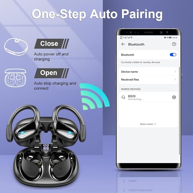 - 2025 Advanced Bluetooth 5.4 and Auto Connection: Wireless earbuds adopt advanced bluetooth 5.3 technology. Compare to 5.2, you can get 2X fast transfer speed and make your sport earbuds be matched more easily and faster. Bluetooth connection distance up to 15m, whether you are at home, in the office, or on the road, you don't have to worry about disconnection with your bluetooth headphones. Open the lid of the charging case, the over-ear headphones can be automatically connected to the previous paired device.