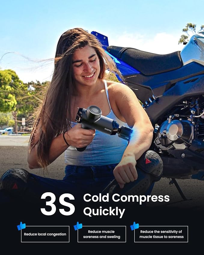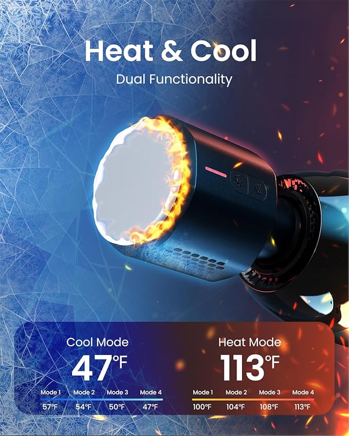 - MASSAGE GUN WITH HEAT AND COLD-It comes with 5 massage heads and 1 heating/cooling head with 8 temperature settings to target different muscle groups. You can use the heat function to speed up muscle recovery or the cold feature to ease muscle tension.