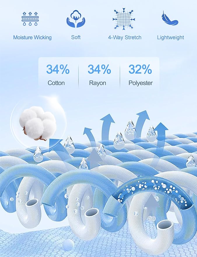 - Moisture Wicking: The 4-way stretch cotton blend increases the breathability of the fabric. It helps you stay cool and dry all day, reduces the sticky feeling.