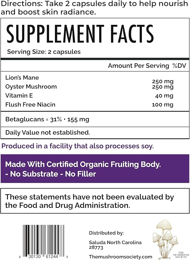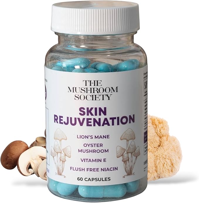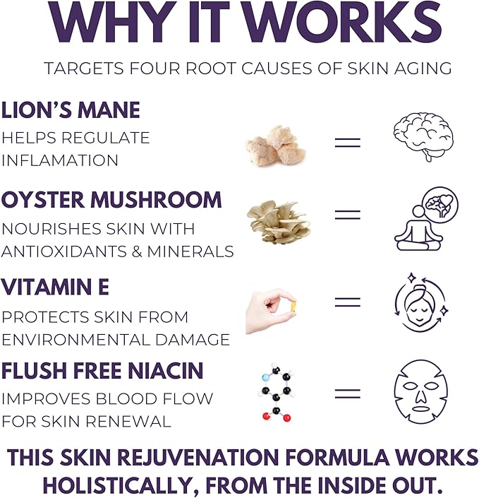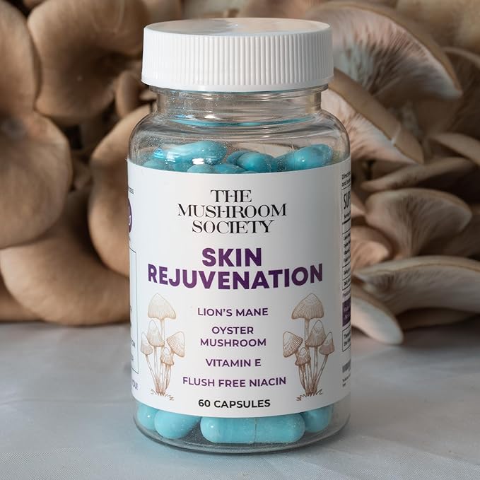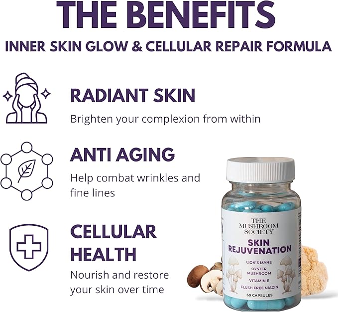 Skin Rejuvenation Supplement - Inner Skin Glow & Cellular Repair Formula – Lion’s Mane, Oyster, Vitamin E, Niacin + Beta-Glucans – Antioxidant + Beauty Blend - 120 Vegan Capsules