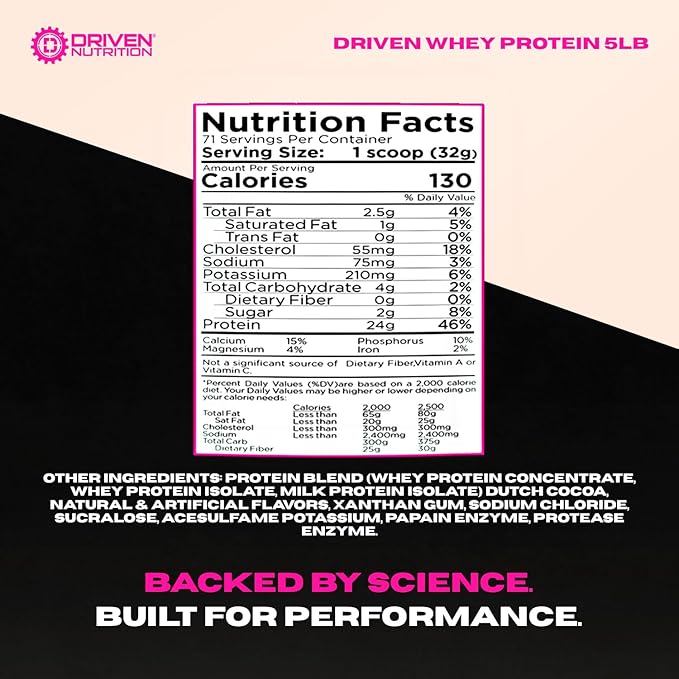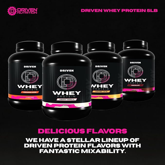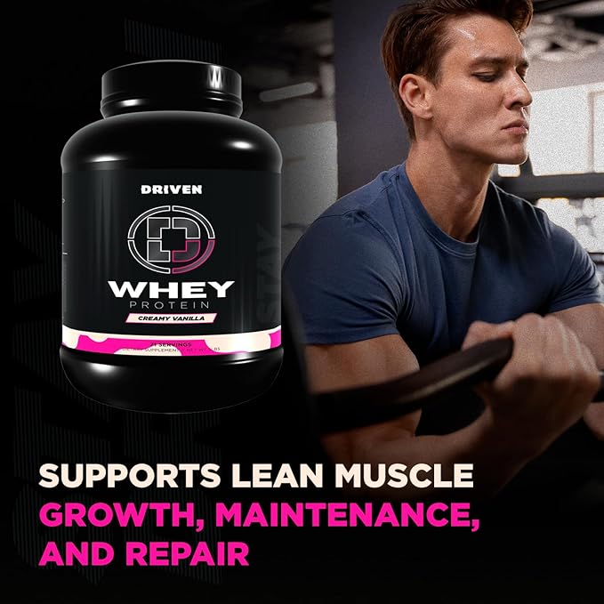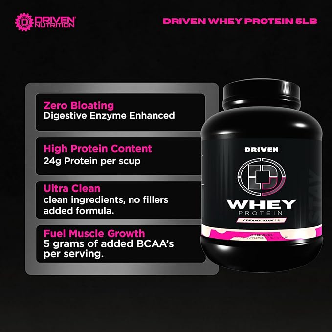 Driven WHEY- Grass Fed Whey Protein Powder: Delicious, Clean Protein Shake- Improve Muscle Recovery with 23 Grams of Protein with Added BCAA and Digestive Enzymes (5 lb, Creamy Vanilla)