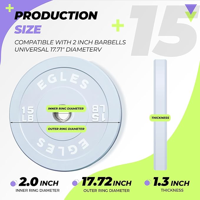 - Available in Versatile Sizes: EGLES Olympic weight plates have 5 sizes from 10LB to 45LB, tailoring to suit various training intensities and skill levels. Each bumper plate has a clear weight marking for quick identification. Olympic-standard 2-inch center hole ensures compatibility with all barbells and dumbbell bars. Whether you're a beginner progressing in strength training or an advanced lifter aiming for personal records, EGLES weight plates provide the perfect foundation for success