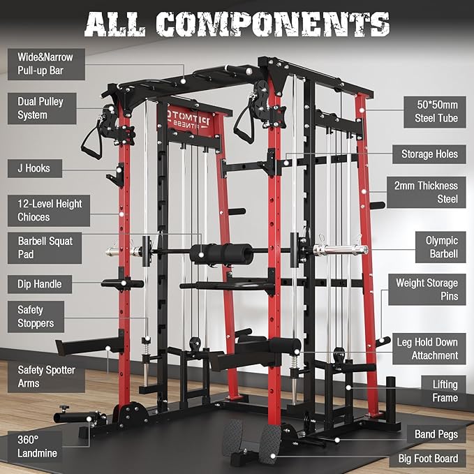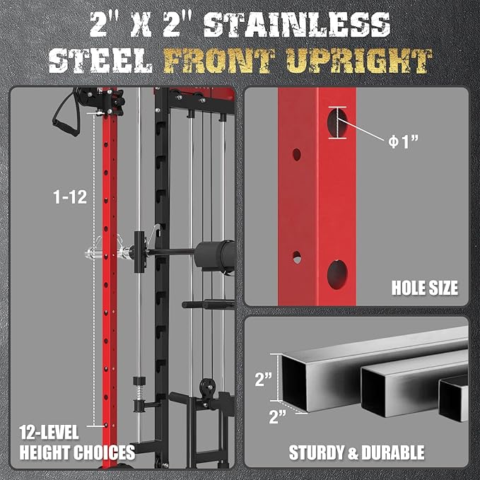- 【Build Your Dream Home Gym】One machine can meet your various needs.It is combined with power cage,smith machine,cable crossover machine,cable station,and pull-up station,providing a complete strength training setup for home use.Perform a wide range of exercises,including squats,cable workouts,pull-ups and more.It is the ideal equipment for full-body strength training,whether it is a fitness beginner or a professional athlete,can meet diversified fitness needs.