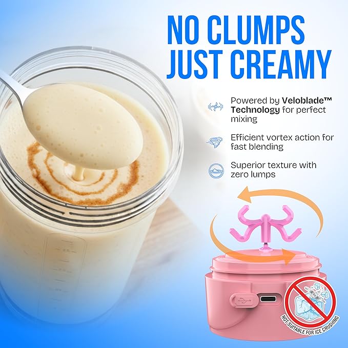 VELOMIX Electric Protein Shaker Bottle - 24 oz | USB-C Rechargeable | Leak Proof Shaker Cups for Protein Shakes | Portable Blender for Shakes and Smoothies (Electric - Pink)