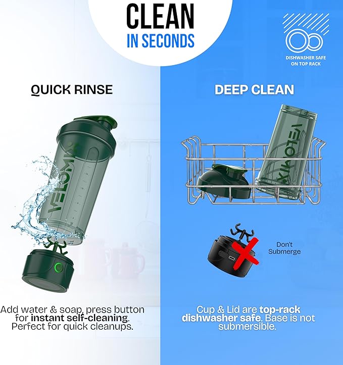 - Easy to Clean in Seconds – Add water + soap, press the button, and let the self-clean cycle do the work. Bottle and lid are top-rack dishwasher safe (base stays dry).