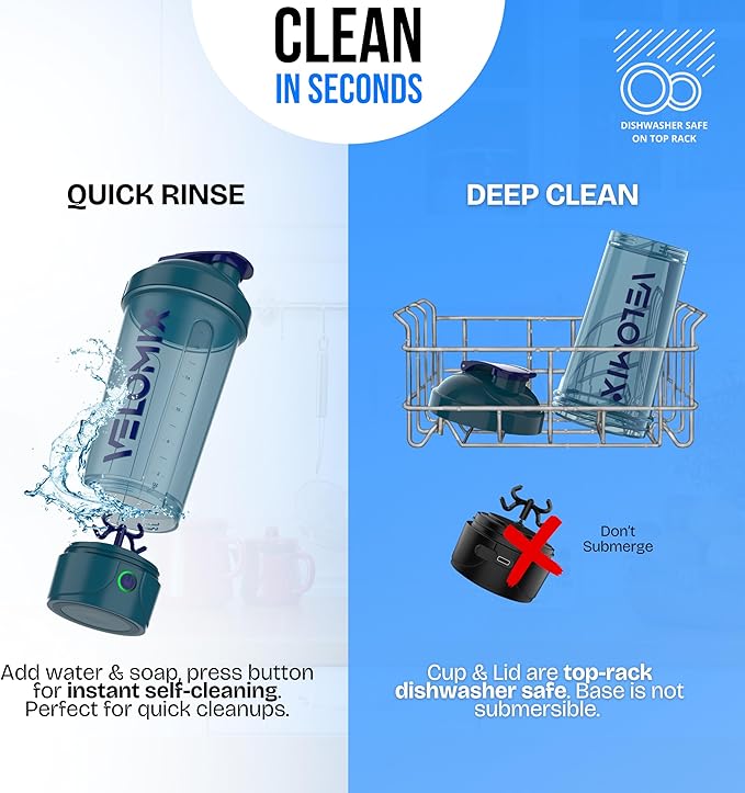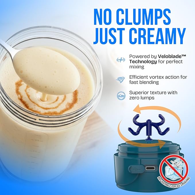 VELOMIX Electric Protein Shaker Bottle - 24 oz | USB-C Rechargeable | Leak Proof Shaker Cups for Protein Shakes | Portable Blender for Shakes and Smoothies (Electric - Blue)
