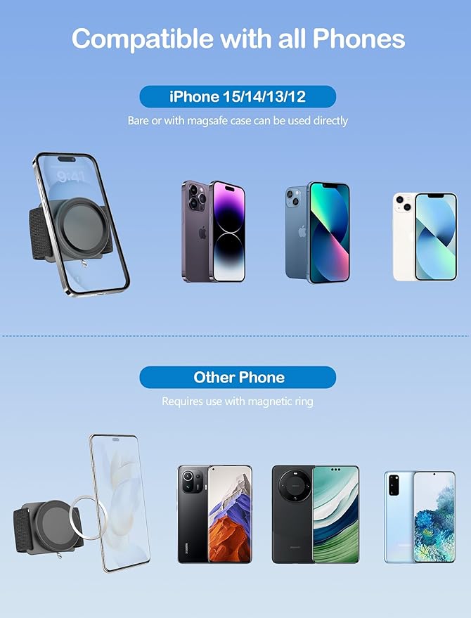 - ⚠️ Note: iPhone 16/15/14/13/12 series with MagSafe or MagSafe-compatible cases can be used directly. For phones or cases without MagSafe, use in conjunction with the supplied magnetic loop, peel off the adhesive of the magnetic ring and stick it to your phone or case.