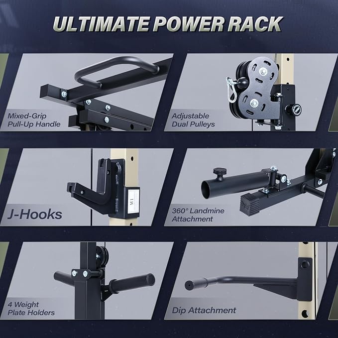 - All-in-One Versatility: Get everything you need for a full-body workout. Your new power rack comes equipped with a high pull-up bar, T-bar, and chest pull-up bar. These accessories unlock countless exercises, so you can target every muscle group from home