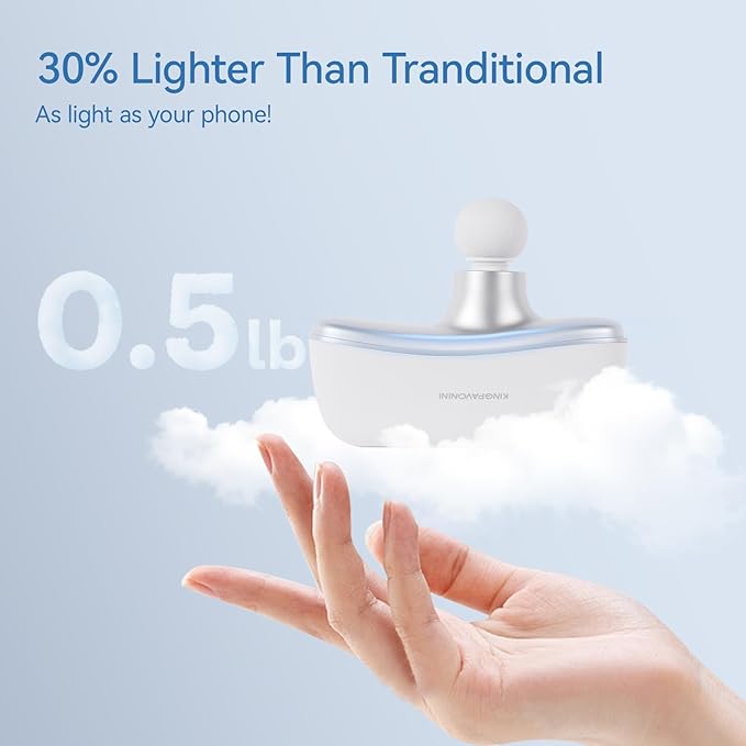 - [Pocket-Sized & Featherlight] Smaller than your phone (4.9" tall) and lighter than your morning coffee (0.5lbs), KingPavonini massage gun mini slips effortlessly into crossbody bags or jacket pockets; easy to hold and carry, the ergonomic grip fits your hands, delivering comfortable massage without wrist strain