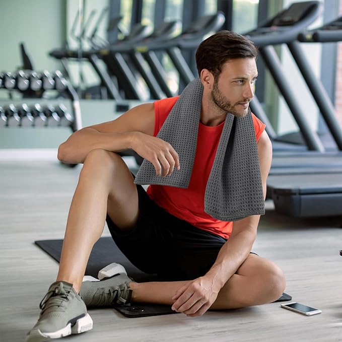 - DURABLE MICROFIBER GYM TOWEL: Each easy to wash towel has its own color coded stitching so you can use a different one each day of the week. Our thin towel will also easily hang over your neck or shoulder for the optimal workout experience.