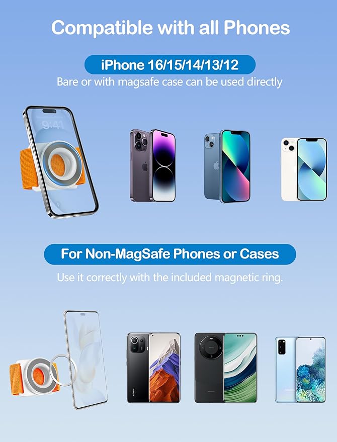 - ⚠️ Note: iPhone 16/15/14/13/12 Pro/Mini with MagSafe or MagSafe-compatible cases can be used directly. For phones or cases without MagSafe, use in conjunction with the supplied magnetic loop, peel off the 3M adhesive of the magnetic ring and stick it firmly to your phone or case. Stability may be affected for oversized or heavier phones (e.g. iPhone 16 Pro Max).