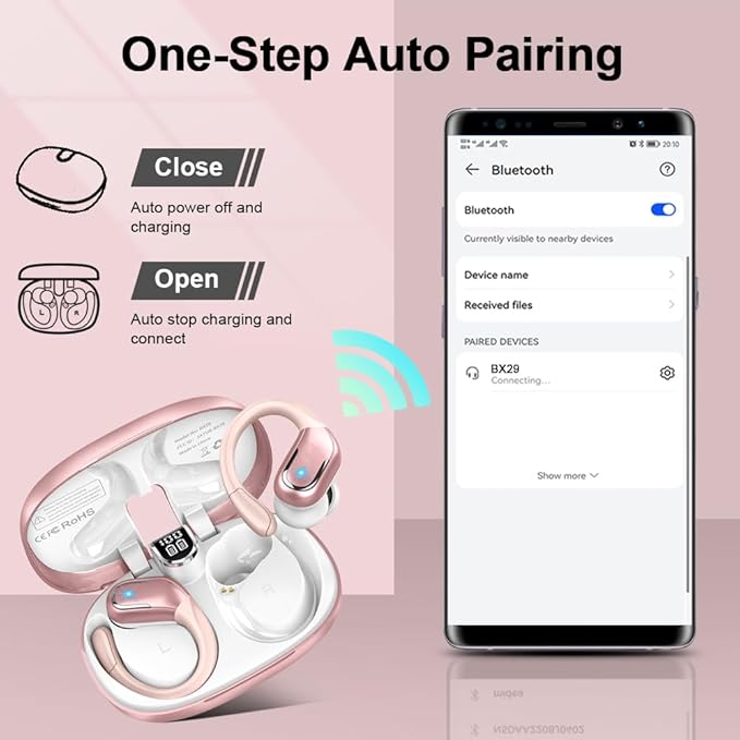 - 2025 Advanced Bluetooth 5.4 and Auto Connection: Wireless earbuds adopt advanced bluetooth 5.3 technology. Compare to 5.2, you can get 2X fast transfer speed and make your sport earbuds be matched more easily and faster. Bluetooth connection distance up to 15m, whether you are at home, in the office, or on the road, you don't have to worry about disconnection with your bluetooth headphones. Open the lid of the charging case, the over-ear headphones can be automatically connected to the previous paired device.