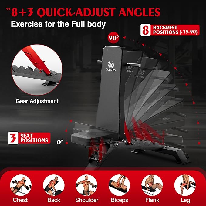 - 8+3 Adjustments – Your All-In-One Workout Partner: Switch from 90° upright rows to decline sit-ups in seconds with the C-lock lever. 8 backrest + 3 seat positions cover incline, flat, and decline—perfect for chest presses, dumbbell curls, and HIIT. Ditch multiple benches; this does it all for full-body training.
