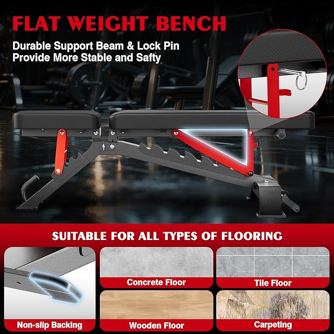 - Double-Lock Safety – Train Fearlessly At Max Weight: Slide the steel lever, secure the safety pin, and activate the triangular reinforced frame—tested for 20,000+ cycles. Guarantees a 180° rock-solid flat position with zero wobble. Lift heavy with confidence—safety’s built into every rep.