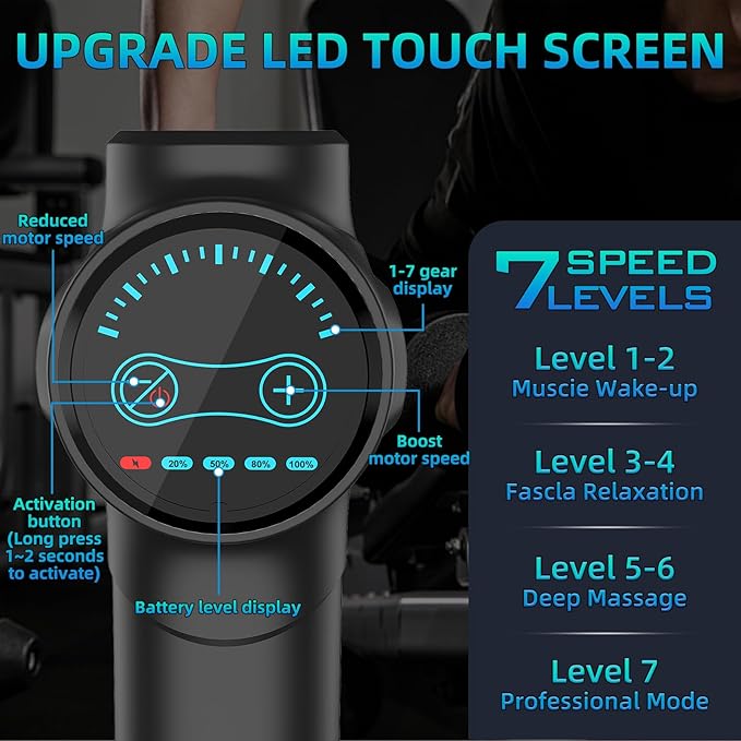 - 【Adjustable Intensity Level Design】:The percussion massage gun is designed with 7 different intensity level, from low, medium to high, and you can find the appropriate amplitude to alleviate all muscle soreness problems. Muscle massage gun adopts an ergonomic design that reduces stress on your wrists, hands and arms, and works on deep tissue,offering you a wonderful experience