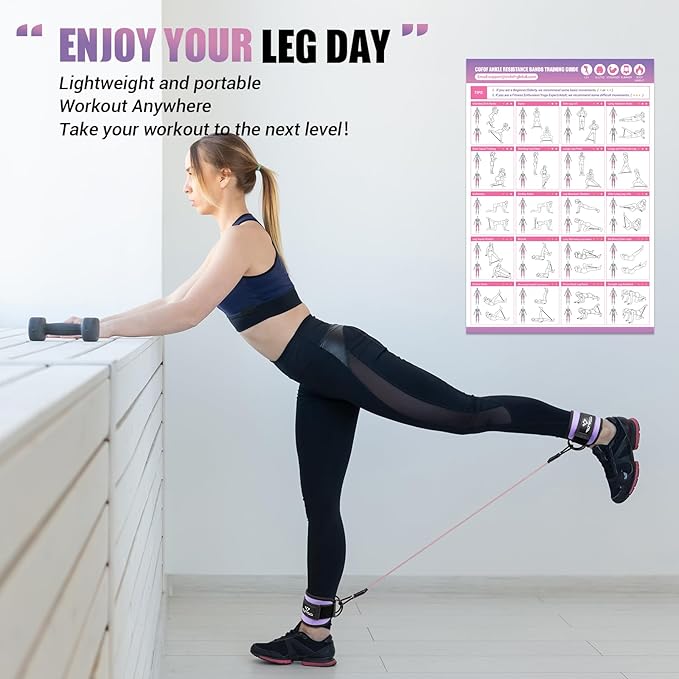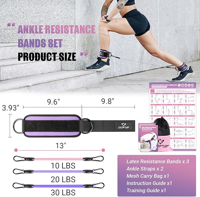 - [ANKLE RESISTANCE BANDS FOR WOMEN] Our ankle strap padding is made from a high quality neoprene material that wraps around your ankle in unparalleled softness and comfort. The matching three resistance bands are made of 100% pure natural latex, which is safer than regular synthetic latex. Best of all, the cool purple training poster we provide is easy to follow even for beginners!