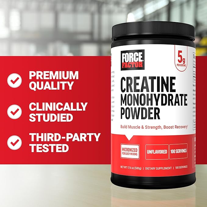 - SCIENTIFICALLY STUDIED 5G DOSE: Each serving of Force Factor Creatine Monohydrate Powder delivers a validated 5g dose of creatine monohydrate—scientifically proven to support strength gains, endurance, and improved athletic performance.