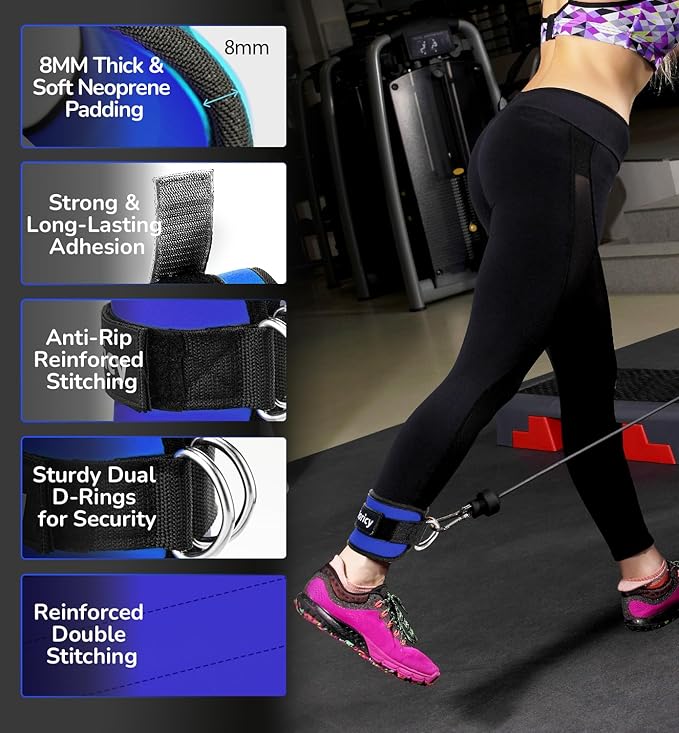 - [THICK PADDING] These workout ankle straps for cable machine are comfortable with 8MM Thick soft neoprene padding fabric, it's durable, no uncomfortable scratching of the skin and don't dig into your ankles, even during heavy resistance workouts!