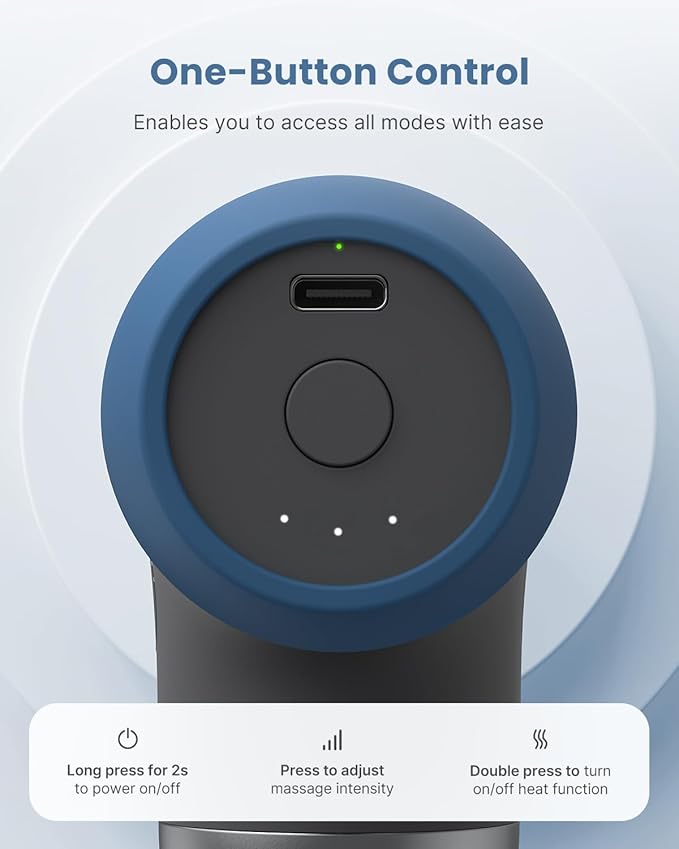 - Effective Heated Massage: Equipped with heat-conductive steel head, the deep tissue massage gun warms up to 46℃/114°F in just 1 minute, effectively reducing muscle tension and soreness.Note:Double press the Power button to enable the heating function. The light is red when the heating function is activated. Do not use the silicone massage head when using the heating function.