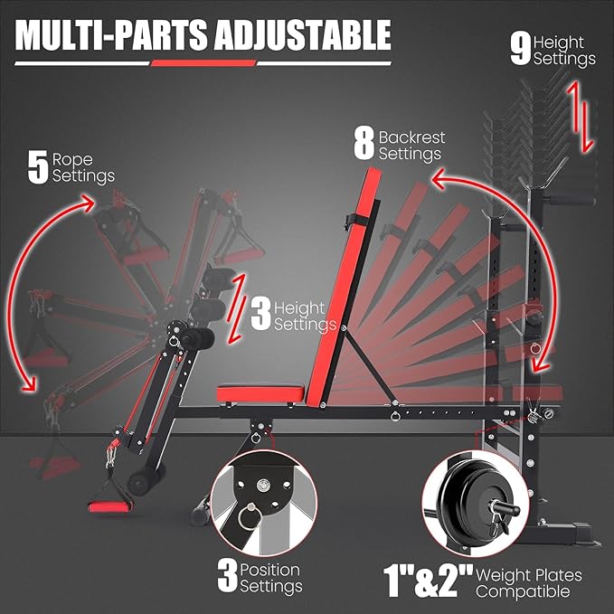 - [Adjustable Weight Bench] - Barbell rack(8 gears) & backrest(8 gears) & rowing machine(5 gears) & leg support(4 gears) are all multi-level adjustable. Adjust your weight bench freely according to your excersice purpose and different workout ways!