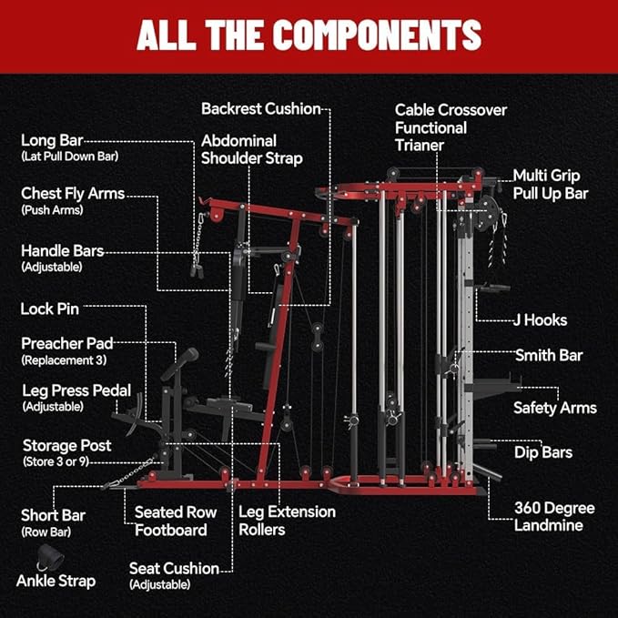 - All in One Home Gym: FAGUS H home gym workout station power cage support all kinds of full body training exercises such as Squat, Chest Press, PEC Fly, Lat Pull Down, Leg Extension, Leg Press, Seated Row, Ab Crunch, Pull Up, Dip Station, Bicep Curl, etc. Just enjoy efficient training and build muscles on your arms, ab, back, hip, legs with a all in one machine in your home gym!