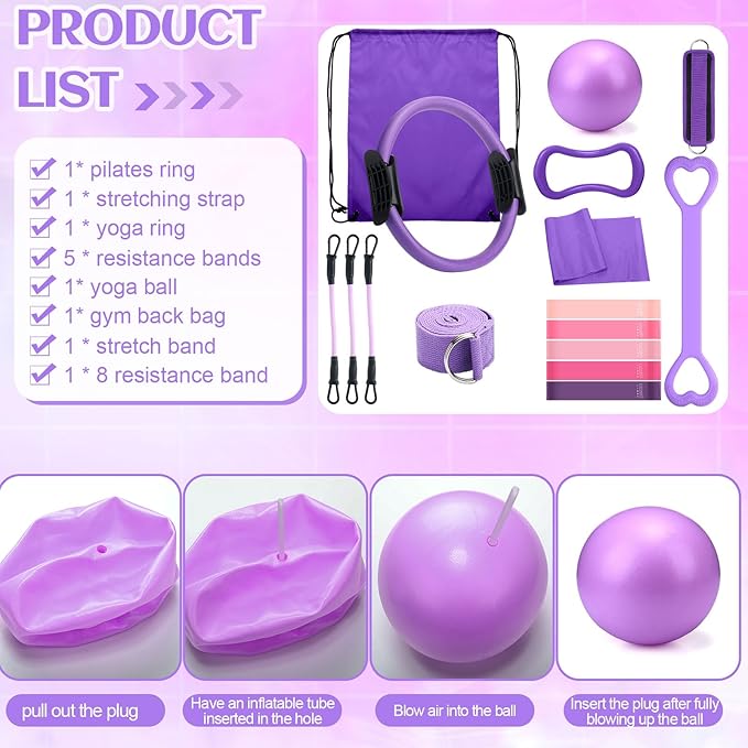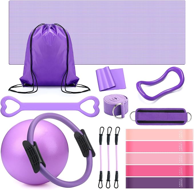 - Comprehensive Pilates Equipment Set: pilates equipment set includes 1 Pilates ring, 1 Pilates ball, 5 yoga resistance bands, 1 figure 8 resistance band, 1 fabric resistance band, 1 yoga mat, 1 elastic band, 1 arm stretcher, 2 ankle resistance bands, 3 latex tubes and 1 fitness drawstring backpack; This well-designed set can meet various Pilates exercise needs, providing a complete solution for home exercise