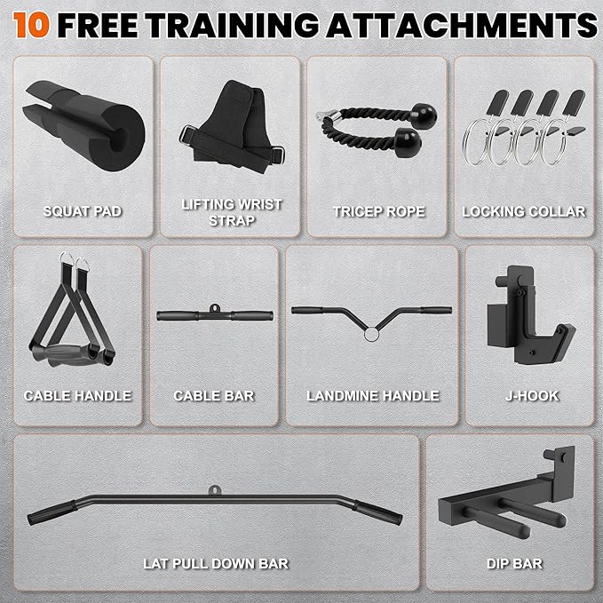 - Pro-Grade Attachments Included for Strength Training: Includes 16 professional attachments: Multi-grip, 2 Sandwich j-cup, dip bars, safety bar, 2 handles, lat pulldown pedal, 360° landmine, 2 Olympic barbell holders, 4-post plate storage, dual cable bars, landmine pivot, lat bar, cable bar, T bar, 6 band pegs, clip.
