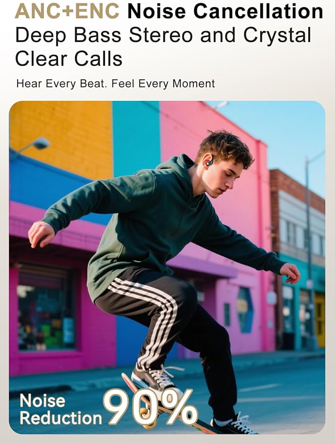 - Pro-Grade Dual-Mode Noise Cancellation: Our noise cancelling earbuds Adaptive ANC proactively silences up to 90% of ambient noise for undisturbed music. During calls, ENC technology instantly kicks in, isolating your voice and cutting background noise by 75% so that you can make a clear call