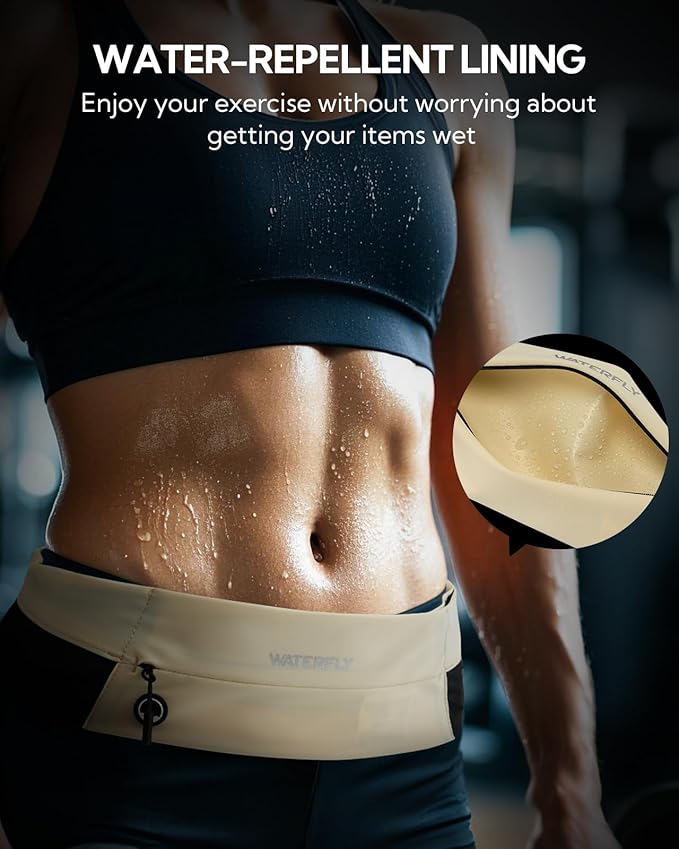 WATERFLY Running Belt Fanny Pack: Slim Waist Bag for Men Women, Workout Fitness Phone Holder for Exercise Marathon Jogging-Beige