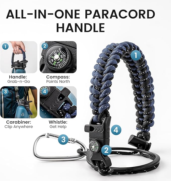 - Adventure Ready Paracord Handle: RAYMYLO 1/2 gallon water jug features a stylish color-coordinated paracord handle with a built-in compass and carabiner clip. This reusable water bottle's paracord handle is lightweight, durable, and perfect for hands-free carrying during hikes, cycling, or camping. Grab & go for spontaneous adventures under the stars!
