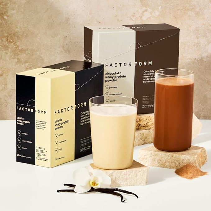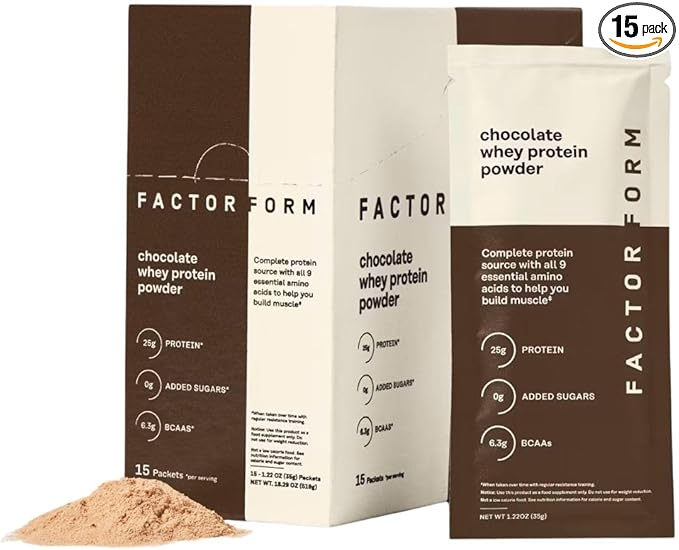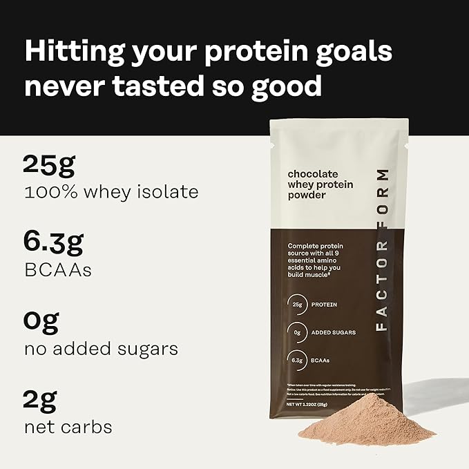 FACTOR FORM Whey Protein Powder | 100% Whey Isolate | 25g Protein & 6.3g BCAAs | Low Carb & Keto-Friendly | No Added Sugar (15 Packets, Chocolate)